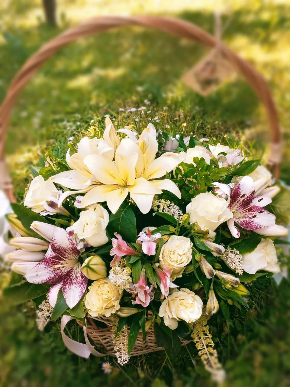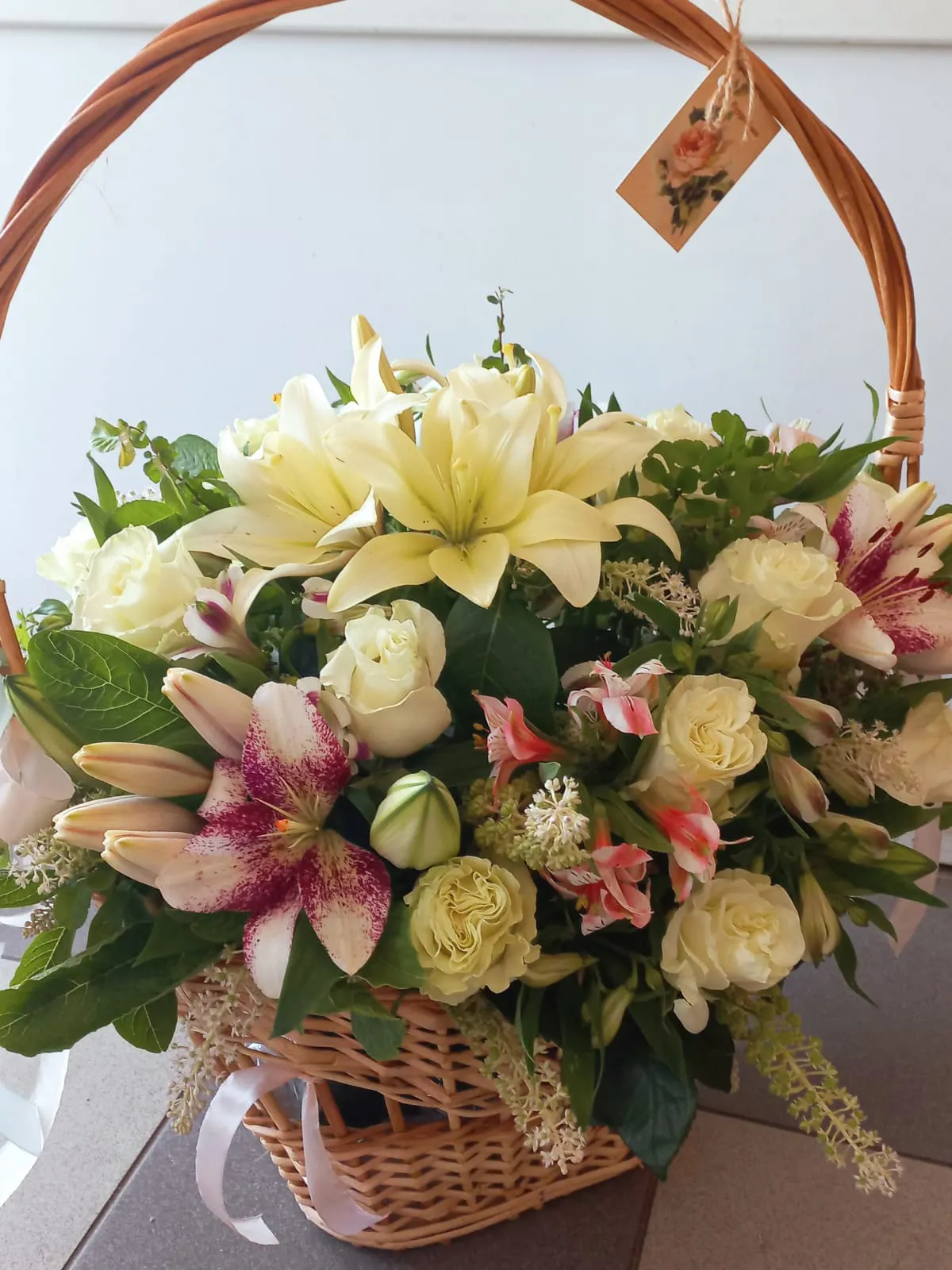 - Стандарт - розы - 5 шт, альстромерия - 6 шт, лилии - 3 шт, кустовая роза - 3 шт, оазис, корзина.