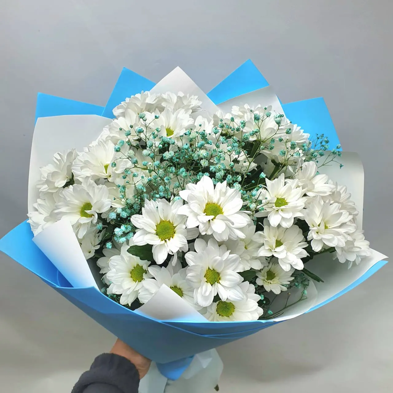 В Данном букете прекрасно сочетается ромашковая хризантема и гипсофила!