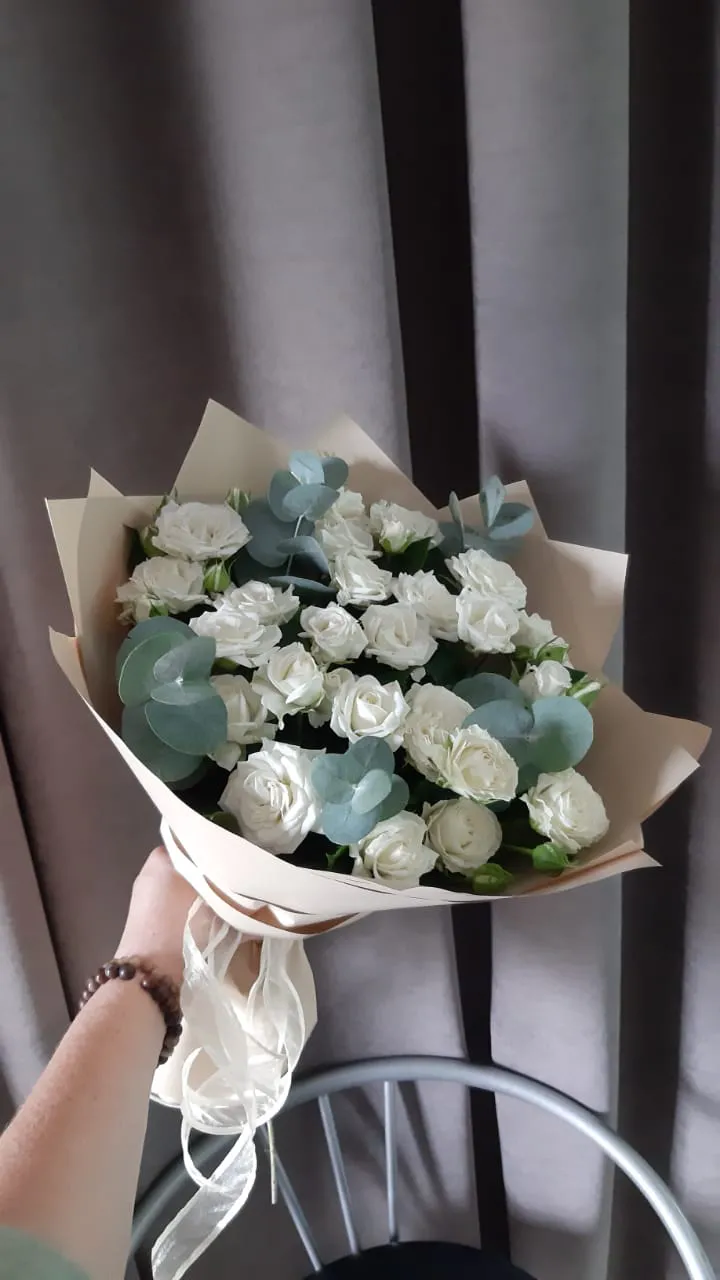 Белые кустовые розы с эвкалиптом Букет из белых кустовых роз