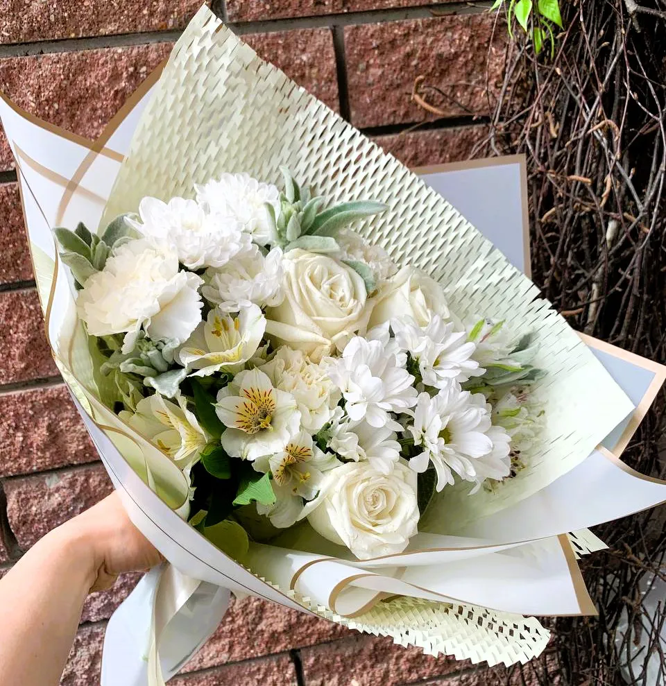 Этот букет, наполненный свежестью и изяществом, сочетает в себе нежные белые розы, прекрасные альстромерии и воздушные хризантемы. Белые розы олицетворяют чистоту и безусловную любовь, их шелковистые лепестки словно сотканы из самого света. Альстромерии добавляют в композицию нежные акценты, их светлые оттенки и уникальная форма соцветий создают чувство динамики и жизни. Хризантемы, с их легкой текстурой и винтовыми лепестками, дополняют букет легкостью и воздушностью, придавая ему обаяние и тепло.