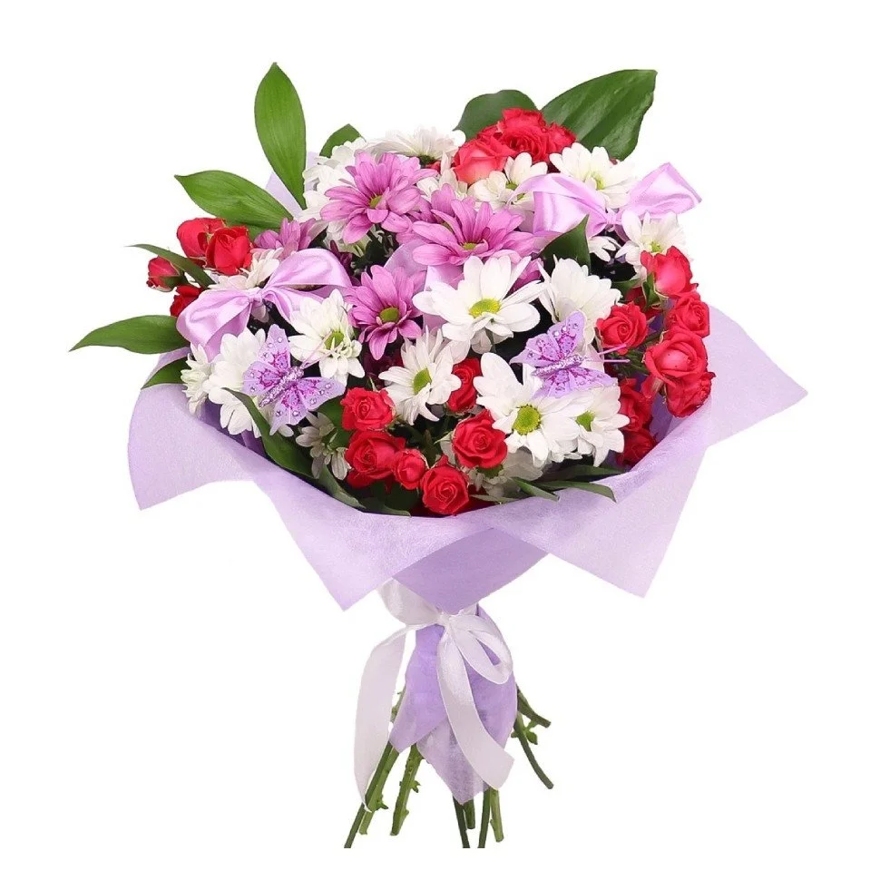 Вариант—Премиум (кустовая хризантема - 7 шт., кустовая роза - 6 шт., зелень, упаковка, лента)