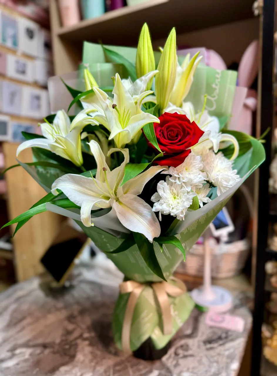 Лилии, роза, кустовая хризантема, упаковка, лента |