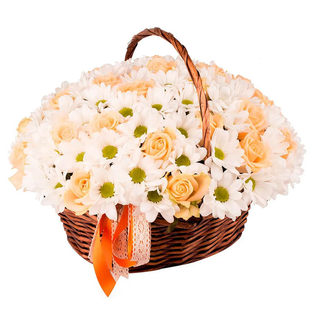 Букет в корзине из хризантем и роз Карамельное облако
