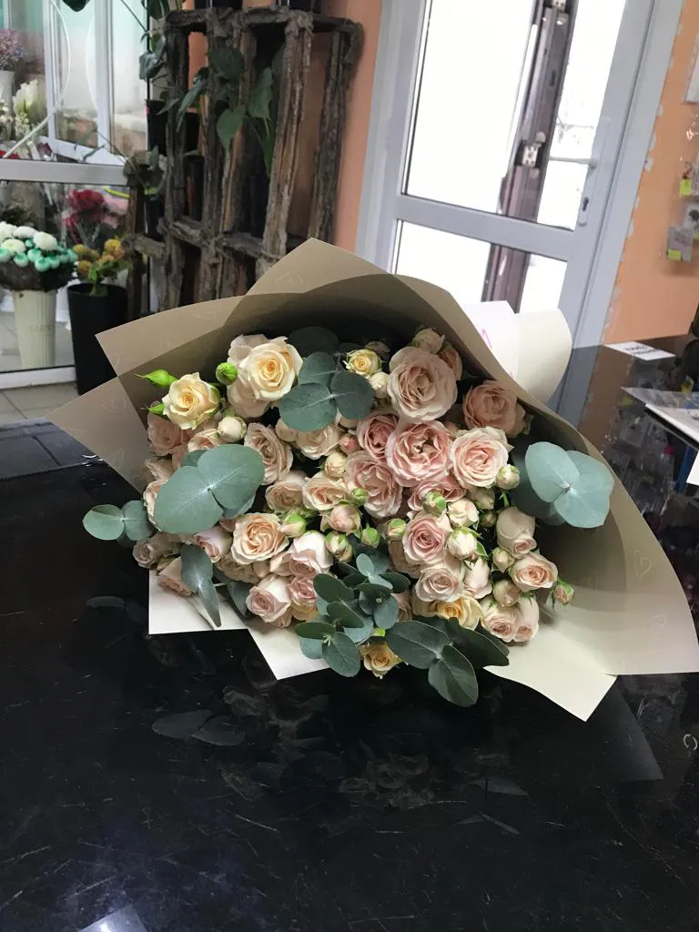 - Средний - кустовая роза - 7 шт., зелень, упаковка, лента