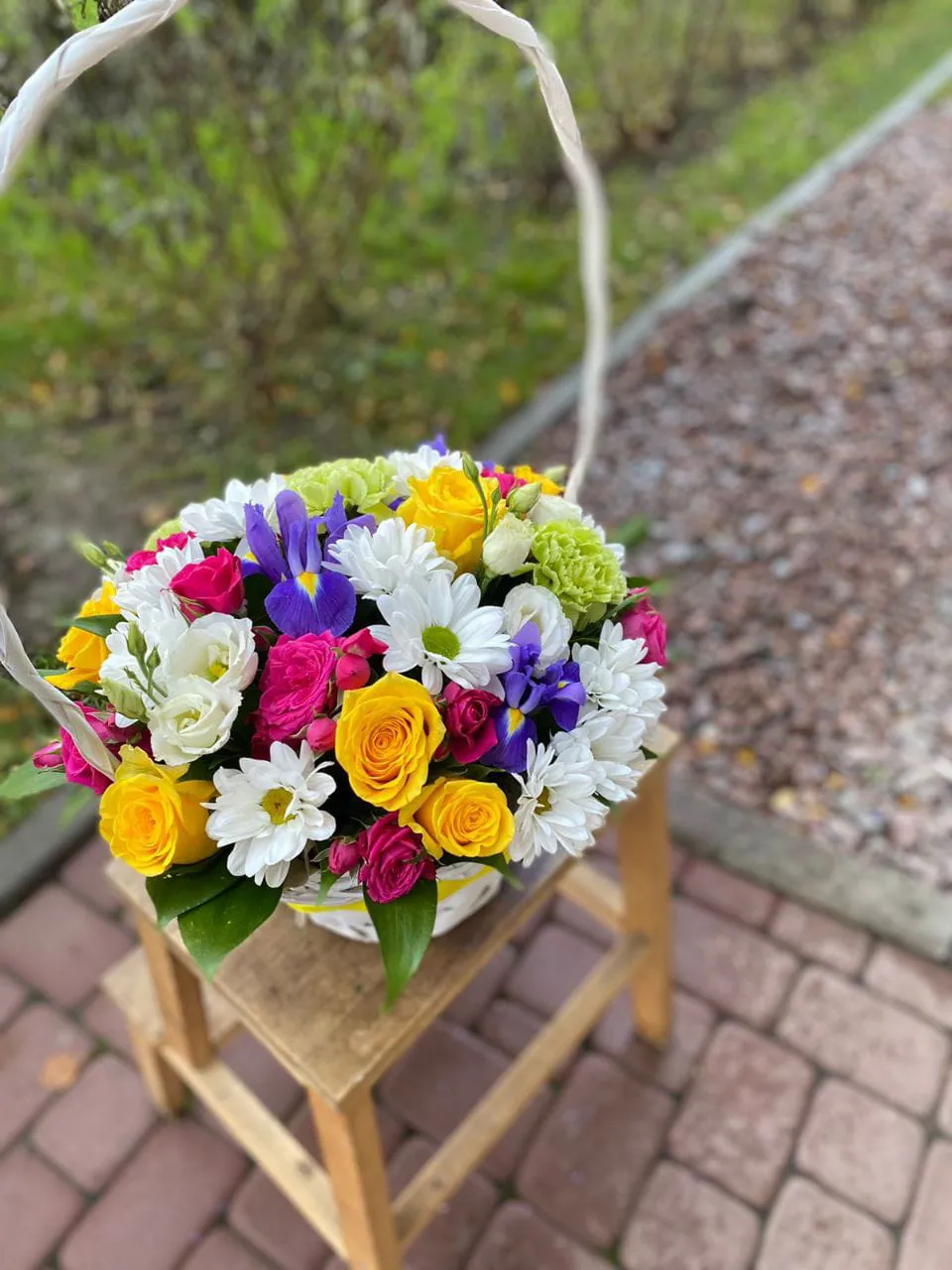 - Стандарт - роза - 7 шт., эустома - 3 шт., хризантема - 3 шт., ирис - 3 шт., гвоздика - 3 шт., салал, оазис, корзина
