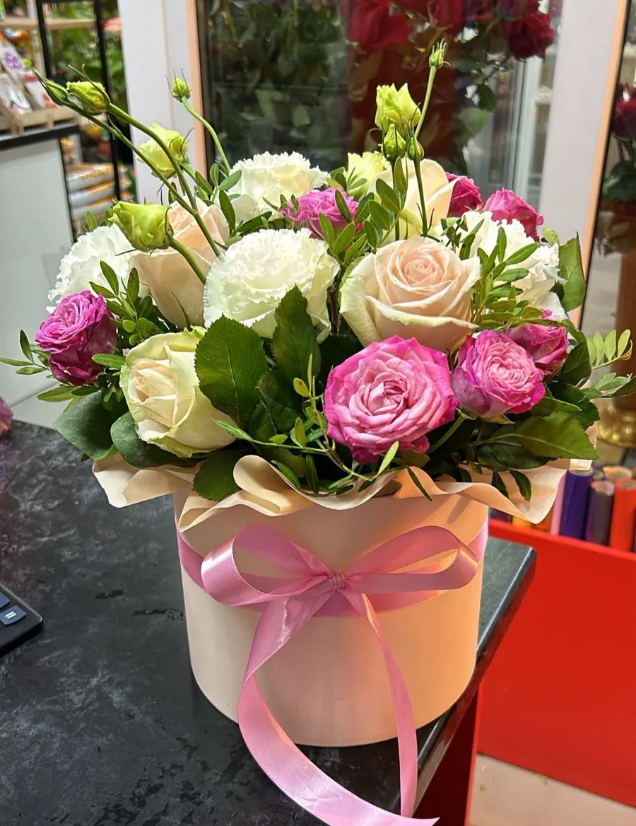 Кустовая роза, одноголовая роза, эустома, зелень, шляпная коробка, лента |