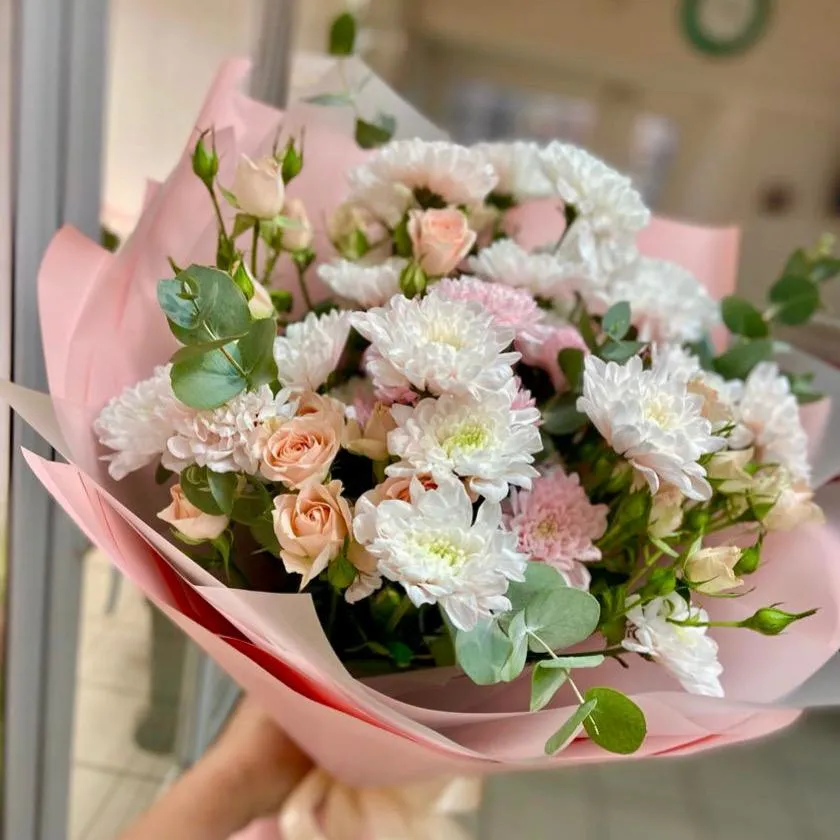 Кустовая хризантема, кустовая роза, зелень, упаковка, лента