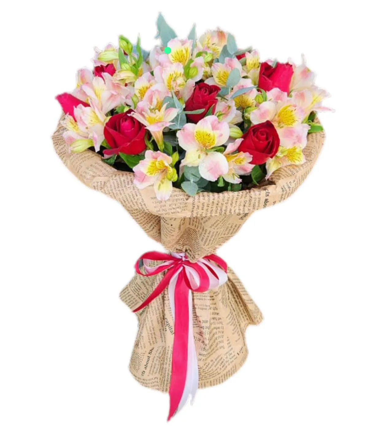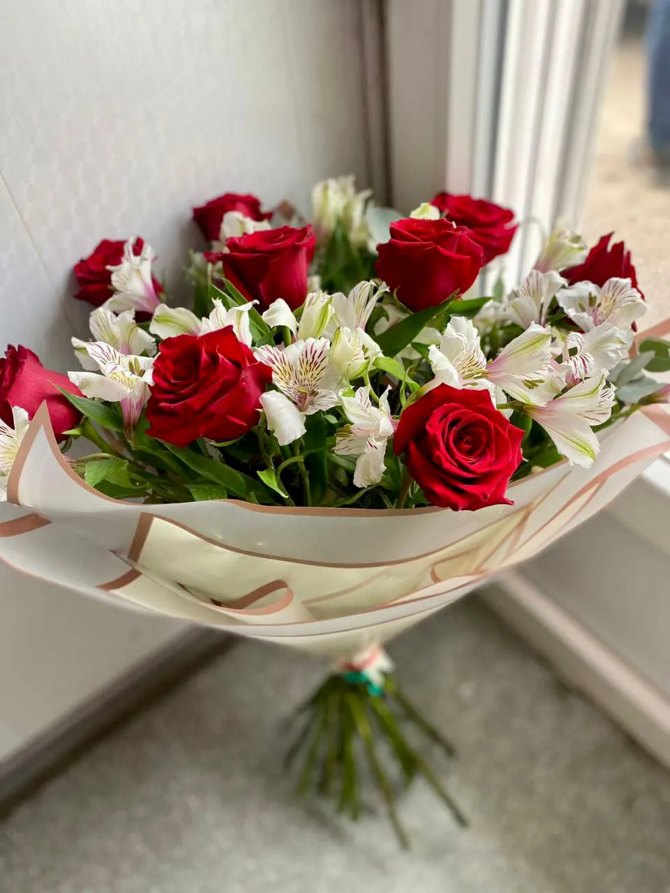 роза альстромерия зелень, упаковка, лента