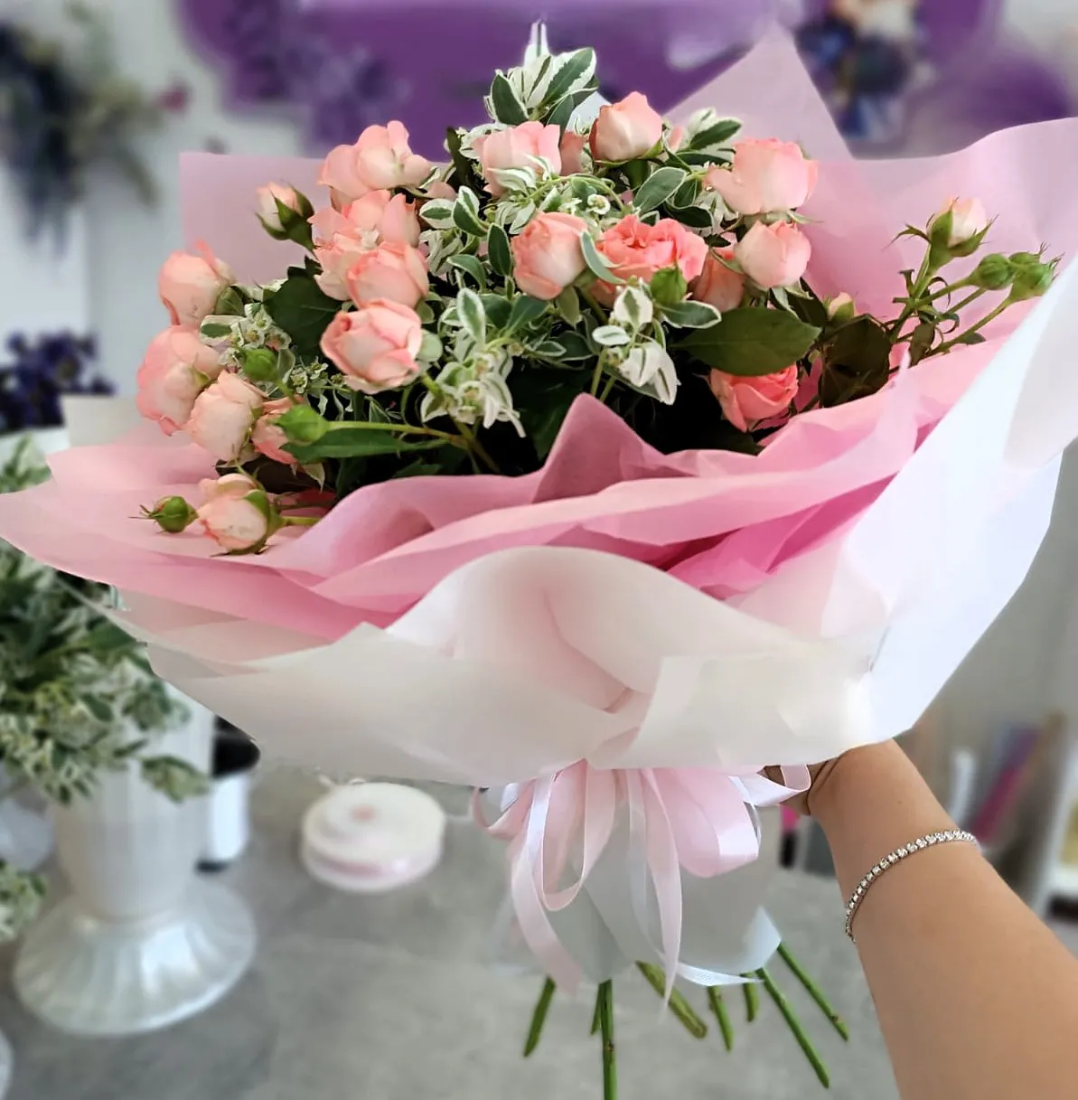 Кустовая роза, зелень, упаковка, лента |