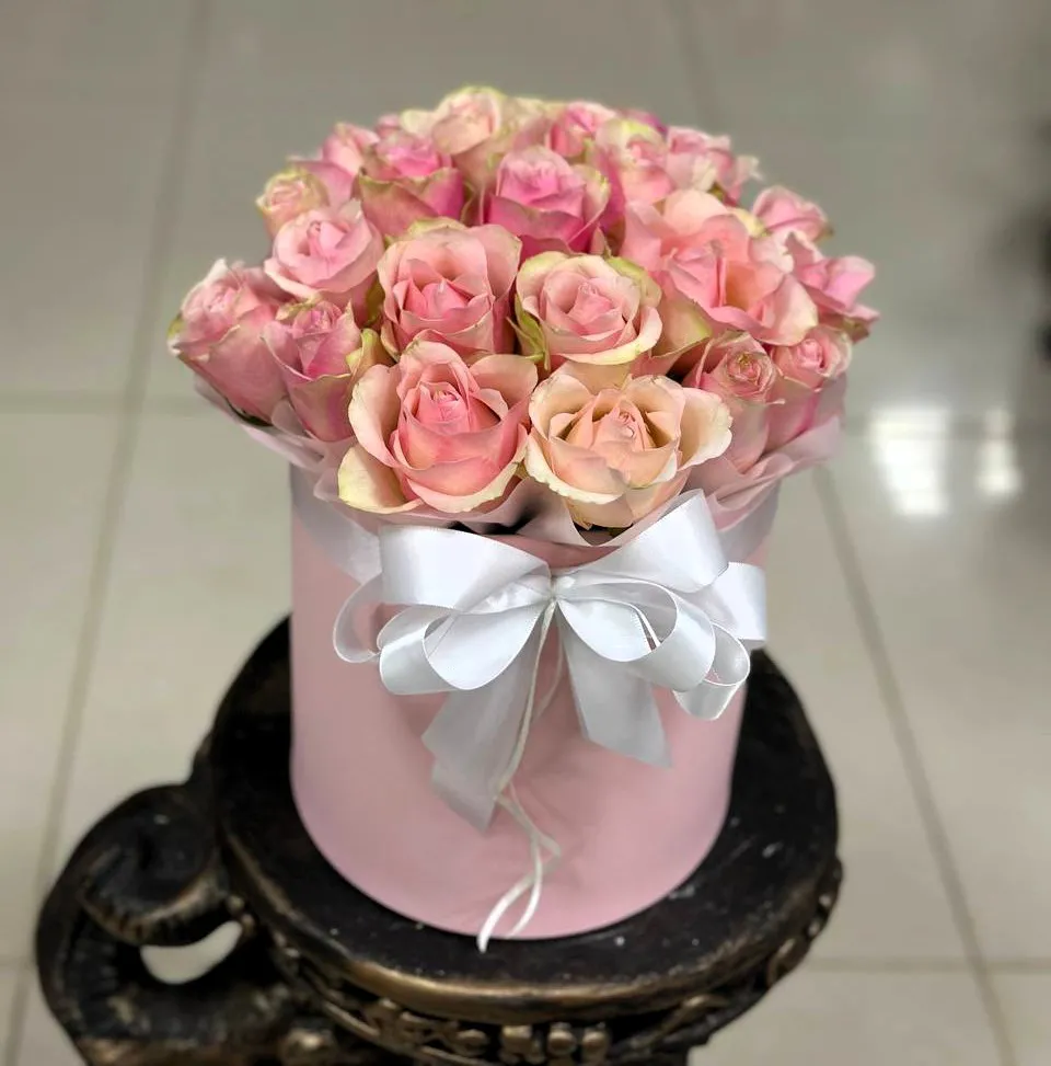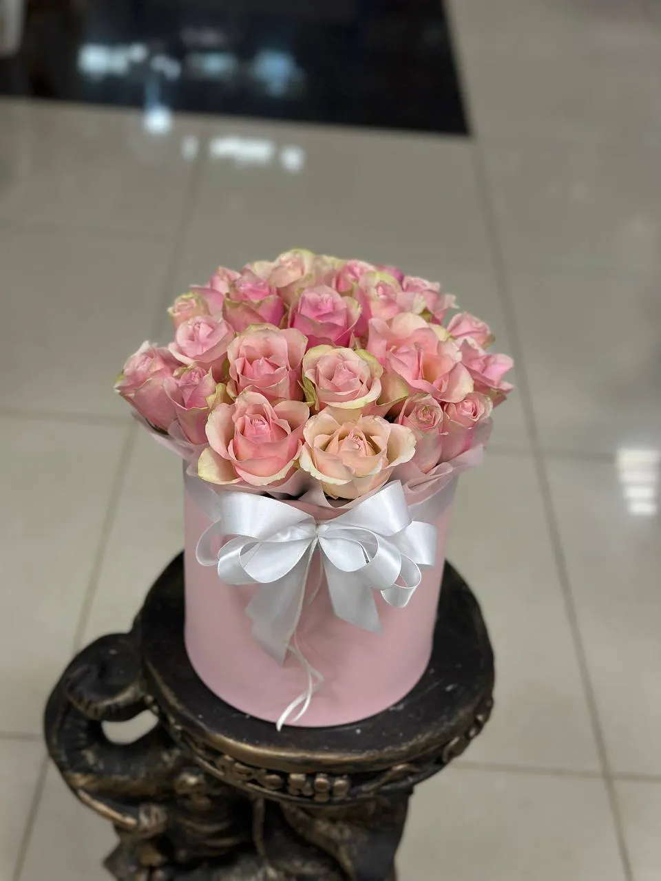 - Средний - роза - 15 шт., зелень, оазис, шляпная коробка