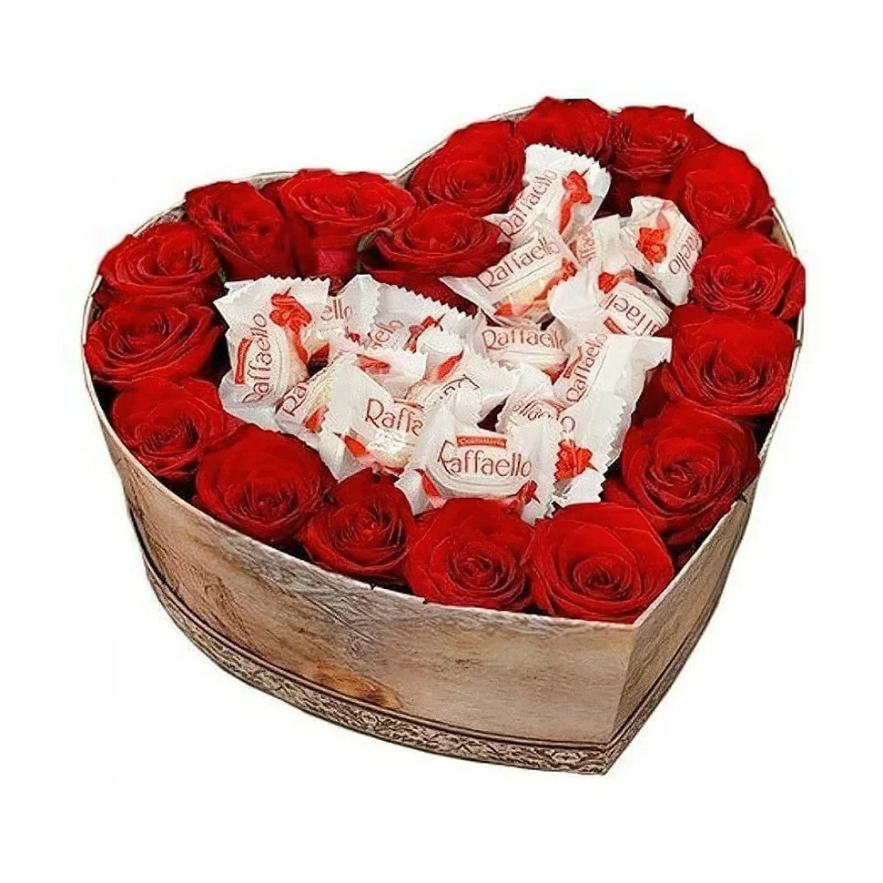 Композиция исполненная в виде сердца с утопающими в нем цветами- яркими, красными розами. и рафаэлло .Коробка в форме сердца- удачное решение для подарка любимой женщине или девушке, а так же маме или близкой подруге, подарить композицию можно в любом, даже самом неожиданном месте.