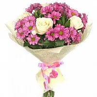 - Средний (Кустовая хризантема 5 шт,, роза 7 шт, зелень, упаковка, лента)