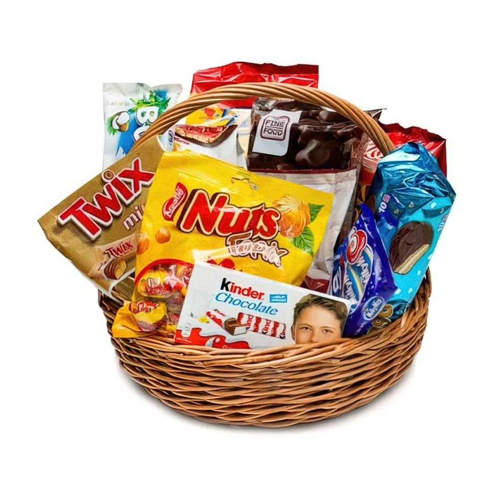 Корзина с шоколадом и конфетами (Kinder, Nuts, Oreo, Bounty, Twix). |