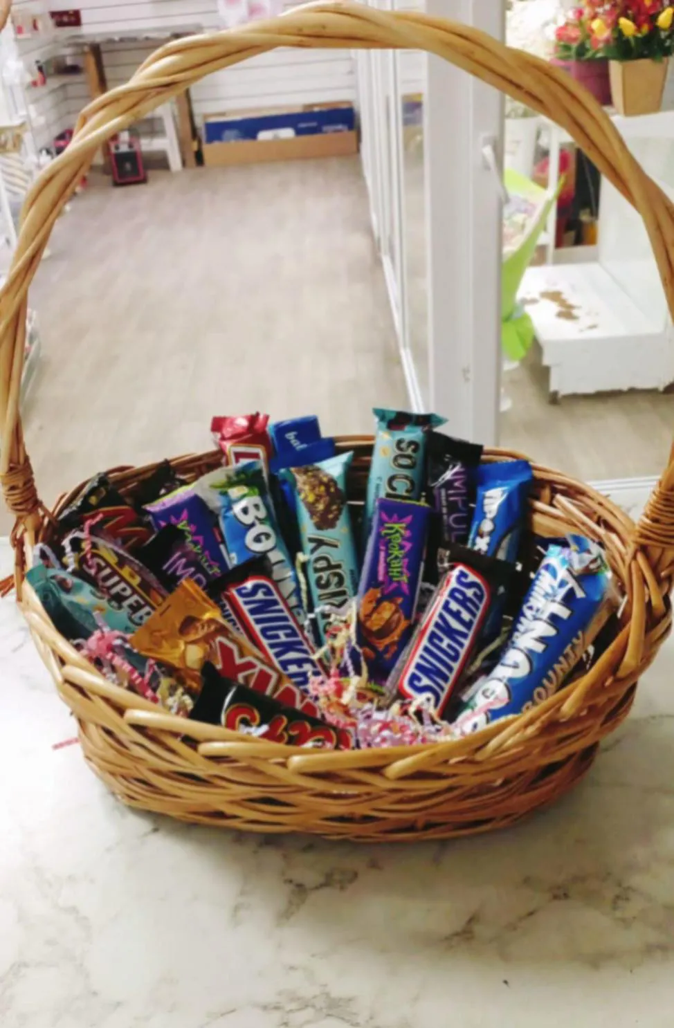 Шоколадные батончики в ассортименте ,корзина