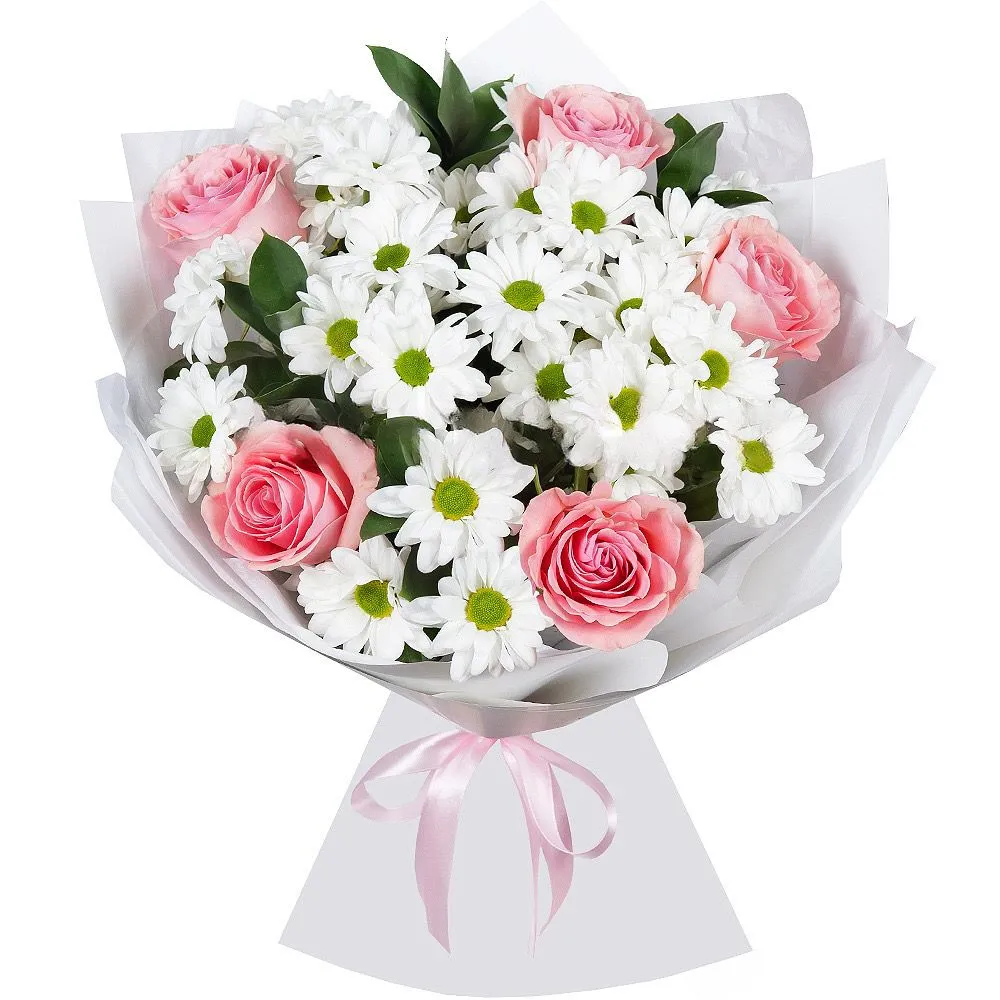 - Средний (Кустовая хризантема 5 шт,, роза 7 шт, зелень, упаковка, лента)