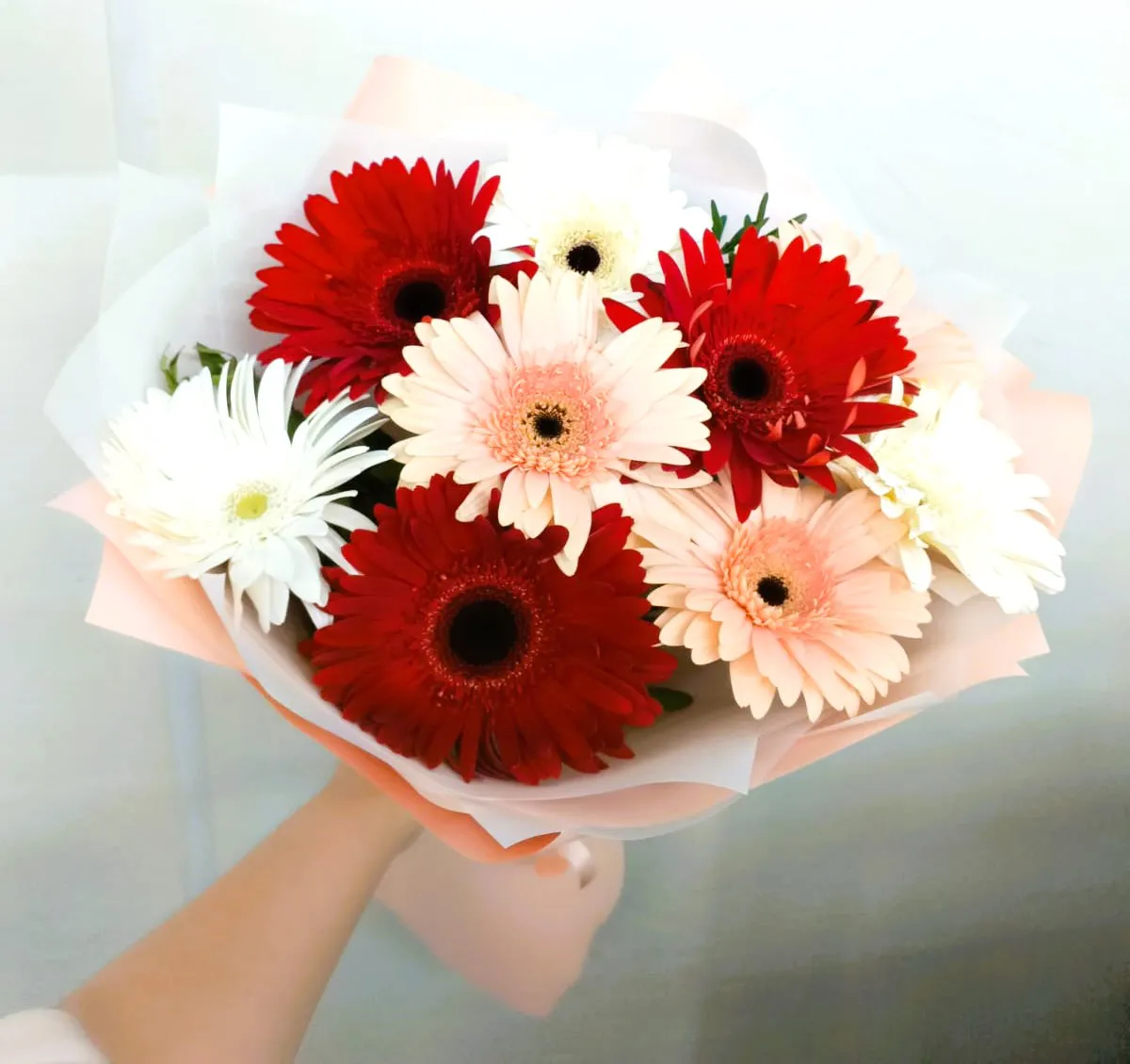 Этот яркий и жизнерадостный букет из гербер — настоящая палитра эмоций и радости! Каждая гербера, словно солнечный лучик, сияет своим нежным оттенком: от нежно-розового и ярко-красного до белоснежно-белого. Эти цветы олицетворяют оптимизм и жизненную энергию, создавая атмосферу праздника и веселья.