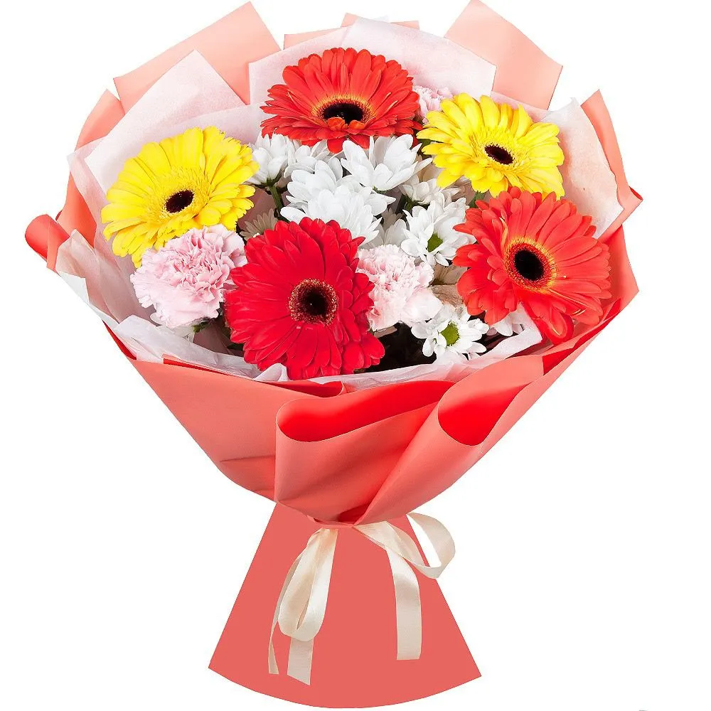 - Средний (5 гербер, 2 кустовые хризантемы, 2 гвоздики)