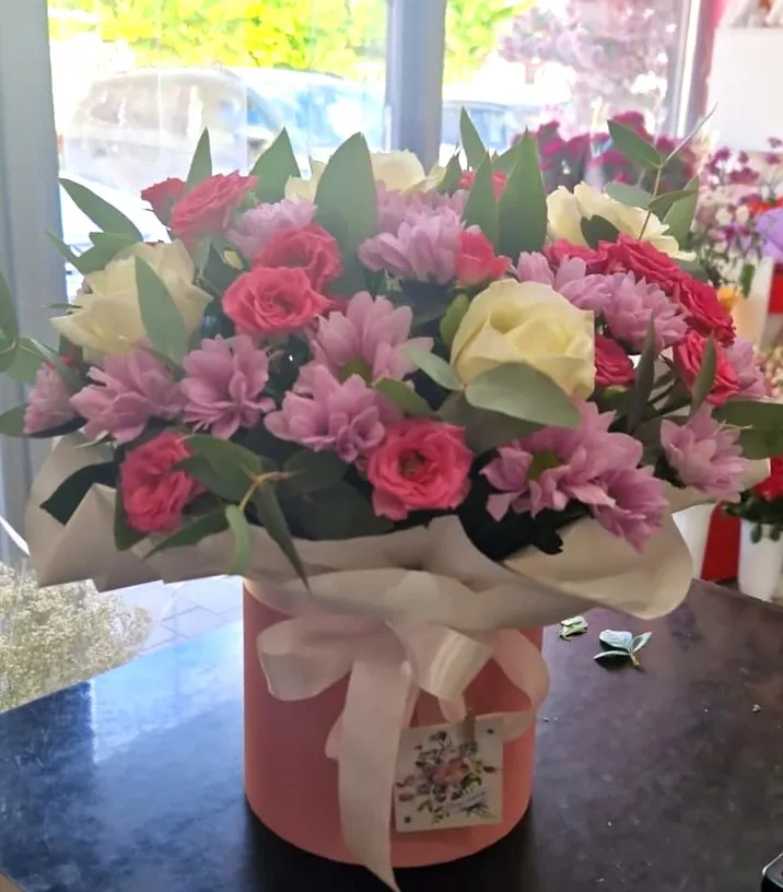 Эта шляпная коробка с белыми розами, кустовыми розами и фиолетовыми хризантемами станет замечательным подарком для любого повода, наполняя пространство атмосферой любви и гармонии.