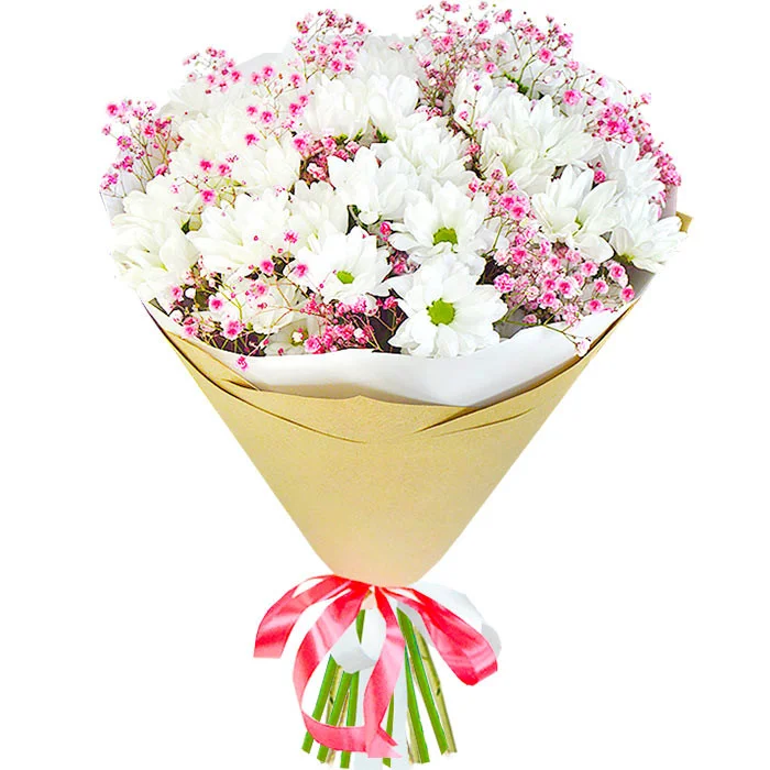 • Средний кустовая хризантема - 7 шт., гипсофила, упаковка, лента