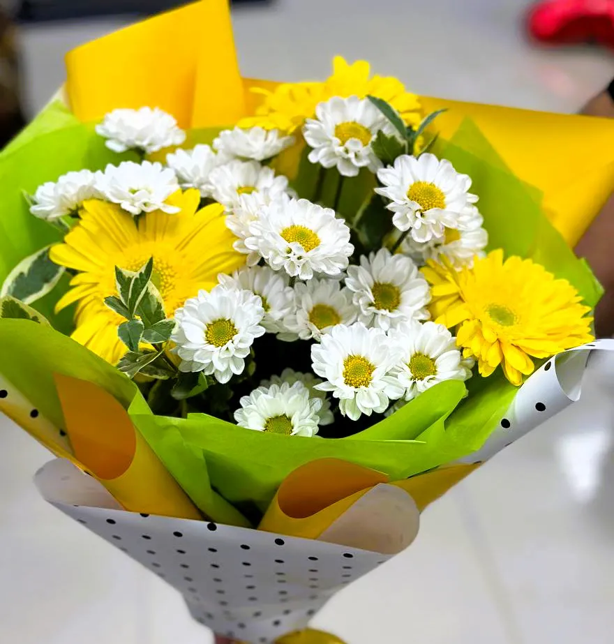 Закажите букет из желтых гербер и хризантем и подарите кусочек счастья! Букет из желтых гербер и хризантем — это яркое и радостное сочетание, способное поднять настроение и подарить улыбку. Желтые герберы символизируют солнце, оптимизм и дружелюбие, а хризантемы добавляют elegance и утонченность. Такой букет станет прекрасным акцентом на любом торжестве, будь то день рождения, свадьба или корпоративное мероприятие.